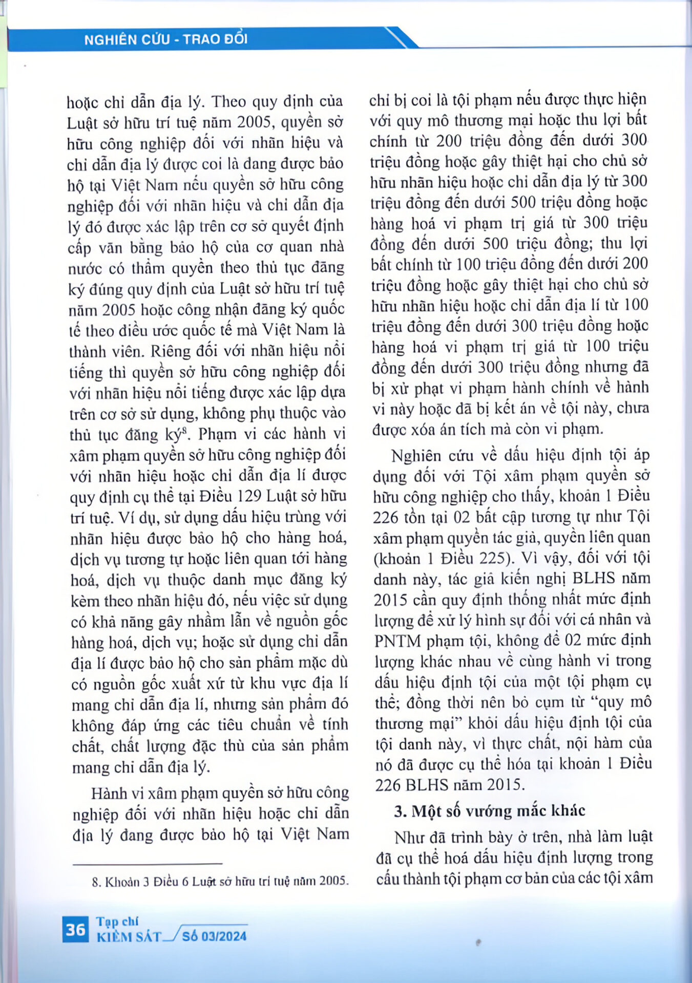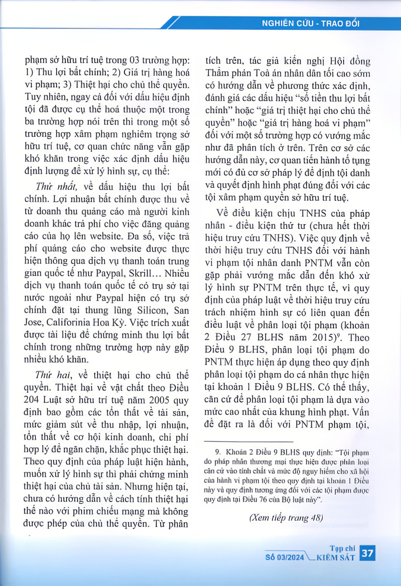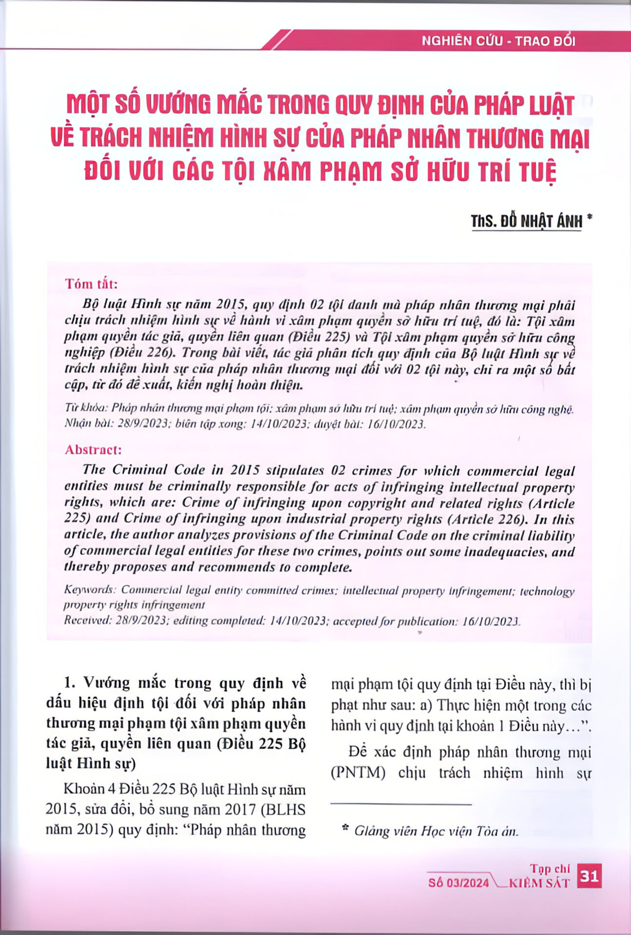 Một Số Vướng Mắc Trong Quy Định Của Pháp Luật Về Trách Nhiệm Hình Sự Của Pháp Nhân Thương Mại Đối Với Các Tội Xâm Phạm Sở Hữu Trí Tuệ