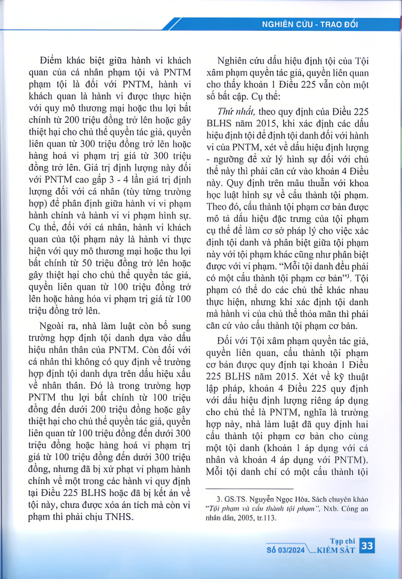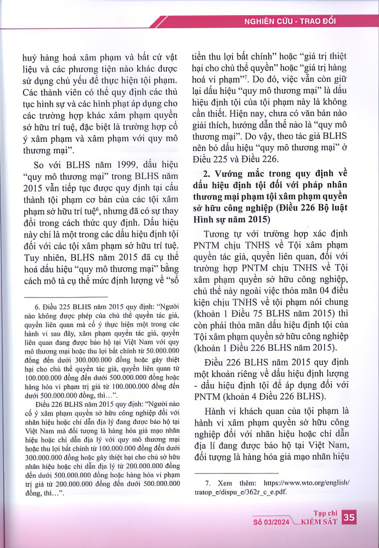 “So với BLHS năm 1999, dấu hiệu “quy mô thương mại” trong BLHS năm 2015 vẫn tiếp tục được quy định tại cấu thành tội phạm cơ bản của các tội xâm phạm sở hữu trí tuệ, nhưng đã có sự thay đổi trong cách thức quy định. Dấu hiệu này chỉ là một trong các dấu hiệu định tội đối với các tội xâm phạm sở hữu trí tuệ. Tuy nhiên, BLHS năm 2015 đã cụ thể hoá dấu hiệu “quy mô thương mại” bằng cách mô tả cụ thể mức định lượng về “số tiền thu lợi bất chính” hoặc “giá trị thiệt hại cho chủ thể quyền” hoặc “giá trị hàng hoá vi phạm”. Do đó, việc vẫn còn giữ lại dấu hiệu “quy mô thương mại” là dấu hiệu định tội của tội phạm này là không cần thiết. Hiện nay, chưa có văn bản nào giải thích, hướng dẫn thế nào là “quy mô thương mại”. Do vậy, theo tác giả BLHS nên bỏ dấu hiệu “quy mô thương mại” ở Điều 225 và Điều 226.” – trích Tạp chí Kiểm sát.