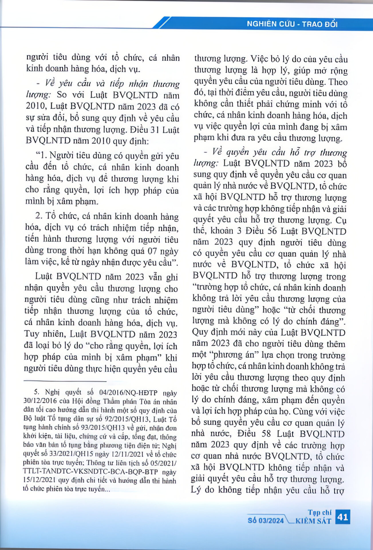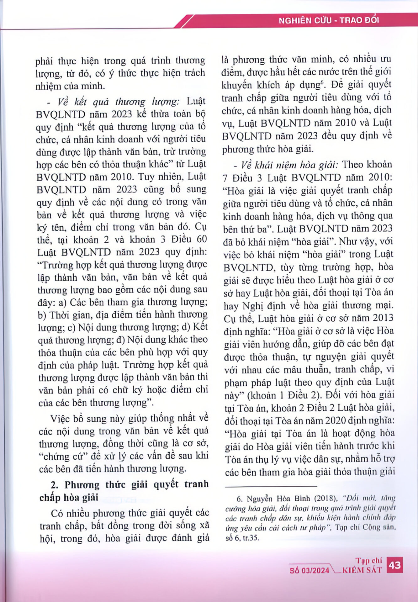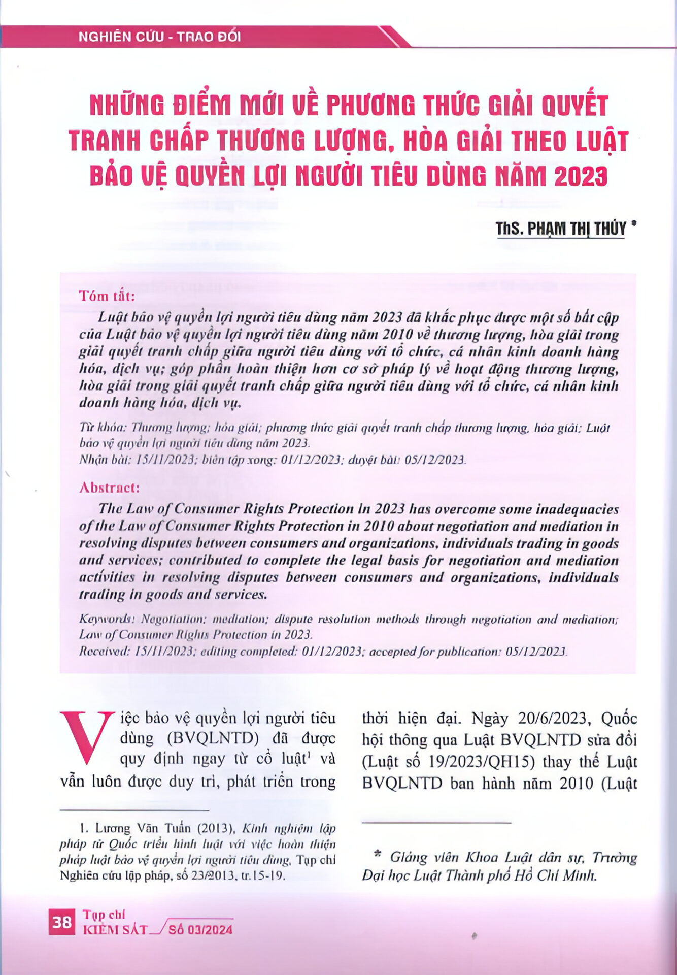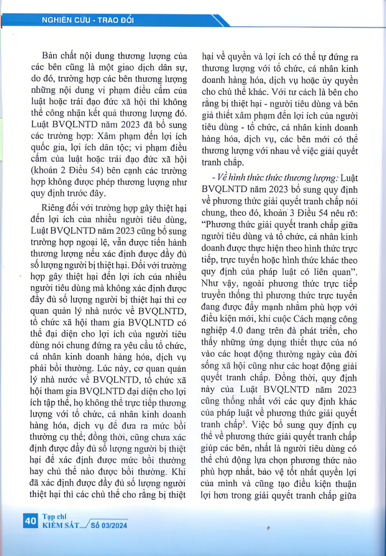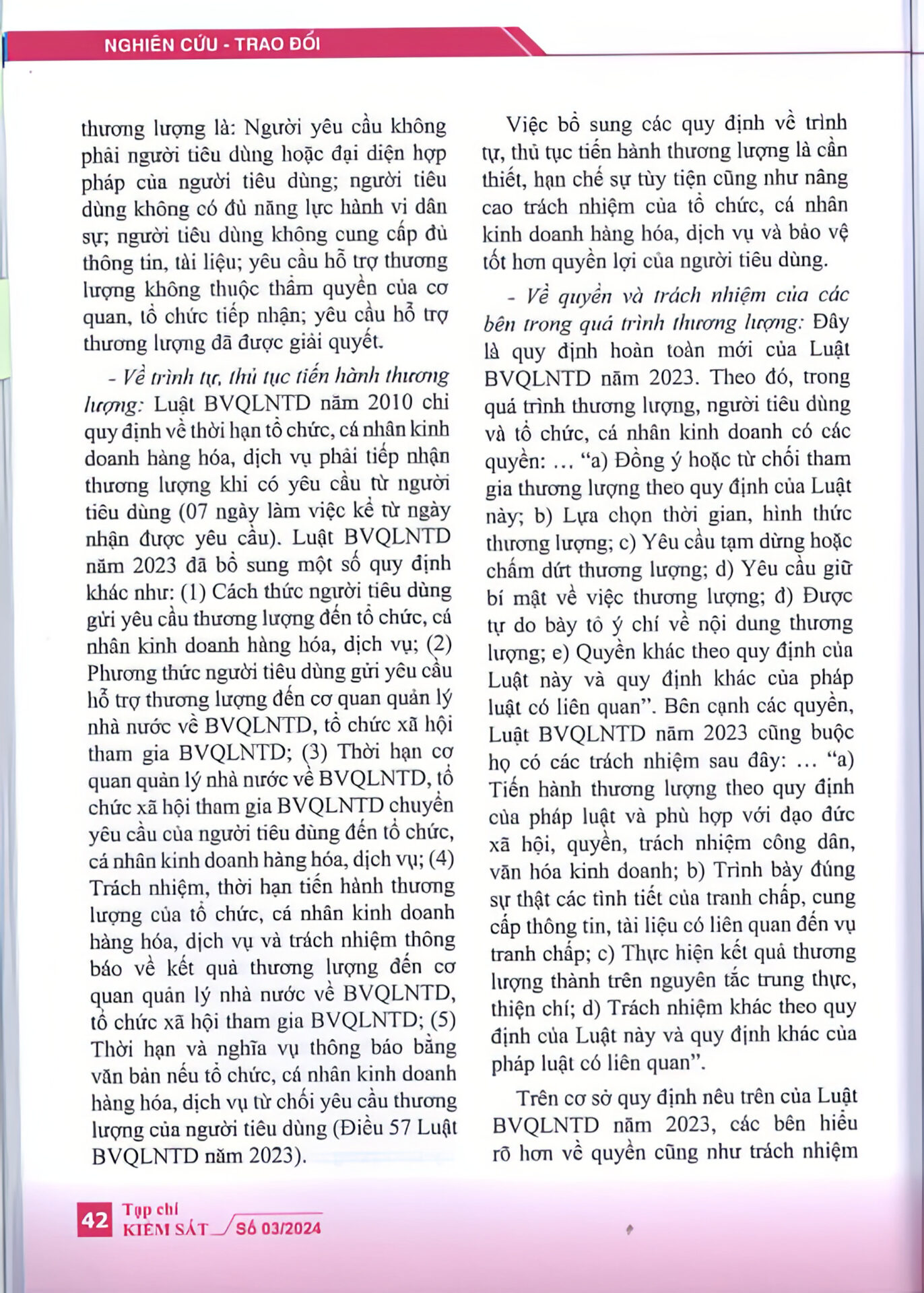 “Luật bảo vệ quyền lợi người tiêu dùng năm 2023 đã khắc phục được một số bất cập của Luật bảo vệ quyền lợi người tiêu dùng năm 2010 về thương lượng, hòa giải trong giải quyết tranh chấp giữa người tiêu dùng với tổ chức, cá nhân kinh doanh hàng hóa, dịch vụ; góp phần hoàn thiện hơn cơ sở pháp lý về hoạt động thương lượng, hòa giải trong giải quyết tranh chấp giữa người tiêu dùng với tổ chức, cá nhân kinh doanh hàng hóa, dịch vụ.” – trích Tạp chí Kiểm sát.